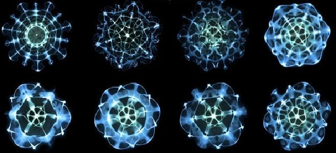 Фигуры киматики — геометрия, которую создаёт звук в воде. Каждый узор — другая частота.